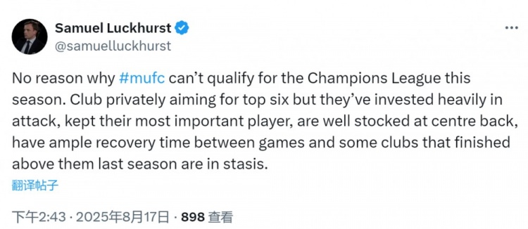 8月17日讯 《曼彻斯特晚报》记者Samuel Luckhurst社媒发文,谈到了曼联本赛季的目标。